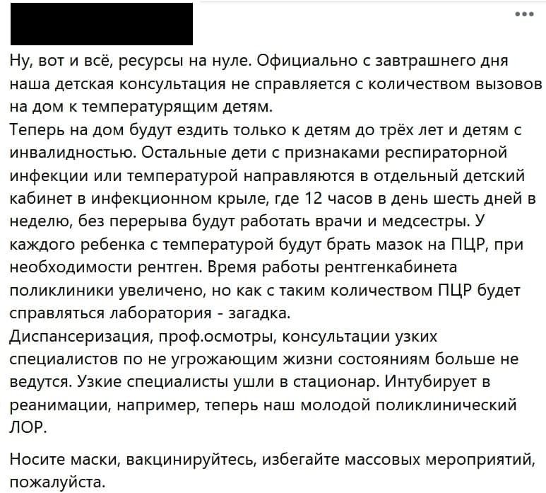 Са слоў лекаркі, астатнія дзеці з прыкметамі рэспіраторнай інфекцыі або тэмпературай будуць накіроўвацца ў асобны дзіцячы кабінет у інфекцыйным крыле, дзе 12 гадзін на дзень шэсць дзён на тыдзень, без перапынку будуць працаваць лекары і медсёстры. У кожнага дзіцяці з тэмпературай будуць браць мазок на ПЛР, пры неабходнасці рэнтген. Спецыяльна для гэтага нават павялічаны час працы паліклінікі, але як дасць рады такой нагрузцы лабараторыя - незразумела. «Ну вось і ўсё, рэсурсы на нулі», - пракаментавала гэтую сітуацыю медработніца.