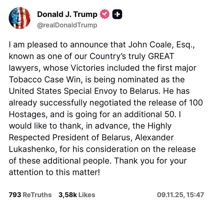 Прэзідэнт ЗША Дональд Трамп таксама паведаміў у сваёй сацыяльнай сетцы Truth Social, што Джон Коул будзе прызначаны на пасаду спецыяльнага пасланніка Злучаных Штатаў у Беларусі.
