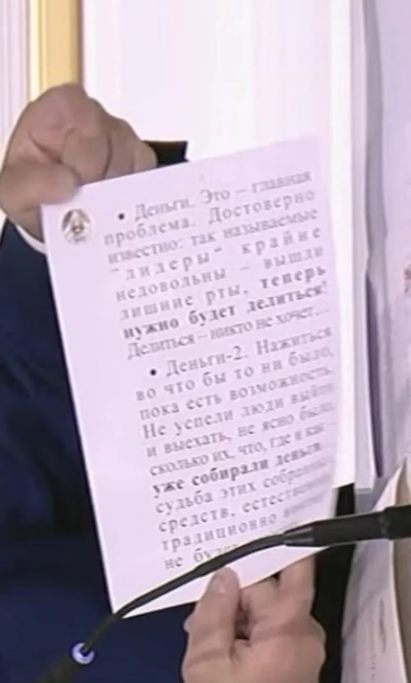 Падчас выступу перад дэлегатамі «УНС» узурпатар Аляксандр Лукашэнка выпадкова паказаў адну са сваіх шпаргалак. Паколькі дыктатар ужо вельмі дрэнна бачыць, іх пішуць гіганцкімі літарамі.