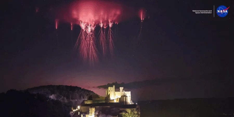 Яго зрабілі ў Францыі, і на ім відаць рэдкая атмасферная з’ява — спрайт. Гэта кароткачасовая ўспышка святла, якая ўзнікае высока над навальнічнымі воблакамі. Працягласць такой з’явы — усяго некалькі мілісекунд, таму ўбачыць яе ўжывую або тым больш зафіксаваць на камеру лічыцца вялікай удачай, піша New Voice.