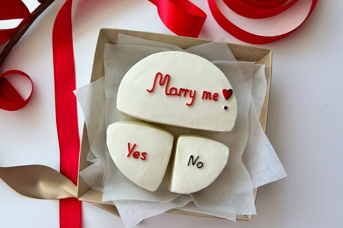 Размову, заведзеную сябрамі, Жэня хутка прыпыніў. Але план быў значна больш прадуманы: Маша загадзя прывезла ў кватэру сяброў невялікі торт. У пэўным сэнсе ён замяніў скрыначку з пярсцёнкам — галоўнае пытанне было выведзена проста на крэме.