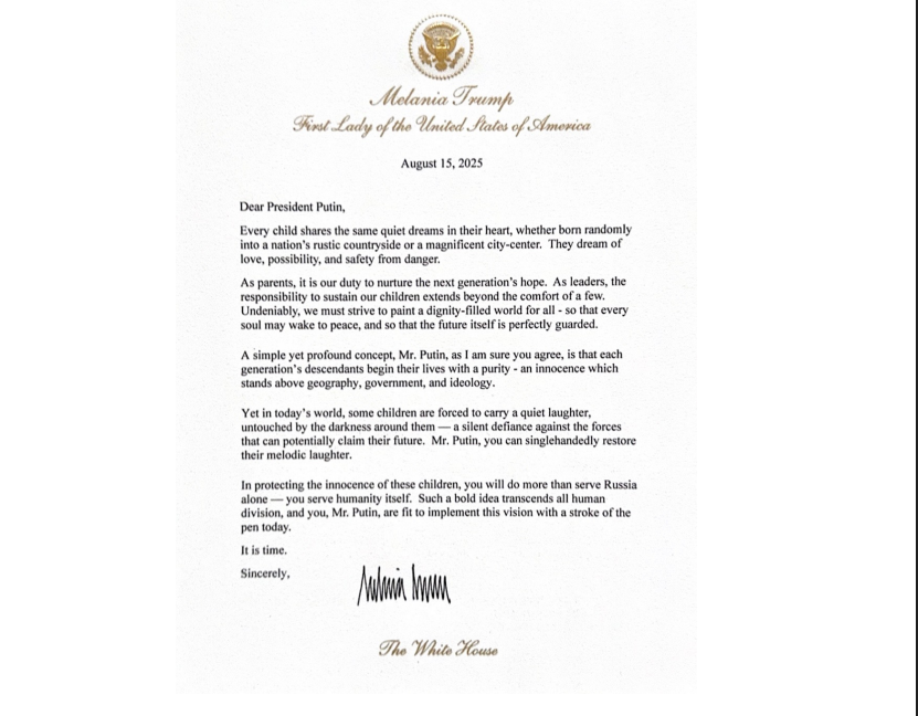 Першая лэдзі ЗША Меланія Трамп у лісце да Уладзіміра Пуціна напісала, што ўсе дзеці свету, незалежна ад месца нараджэння, мараць пра любоў, магчымасці і бяспеку.