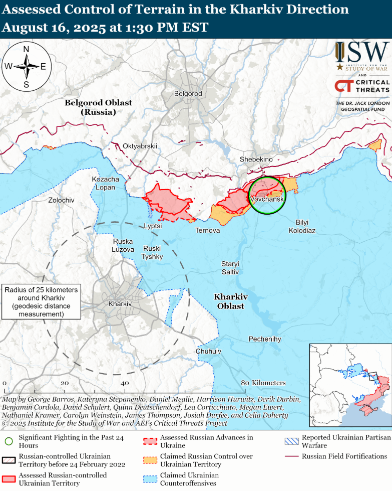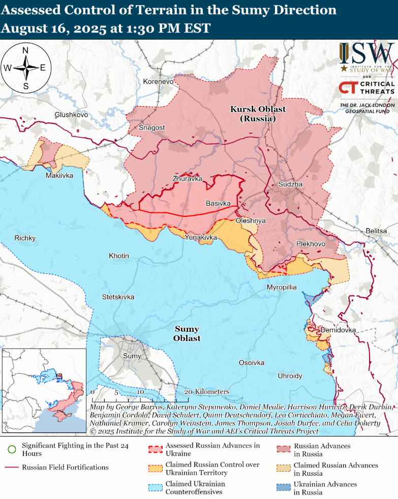 На севере Сумщины враг в тот же день пытался наступать, но безрезультатно. По данным исследователей, 15-16 августа российские войска атаковали вблизи Новоконстантиновки, Варачино и Юнаковки, однако никаких изменений на линии фронта не зафиксировано.