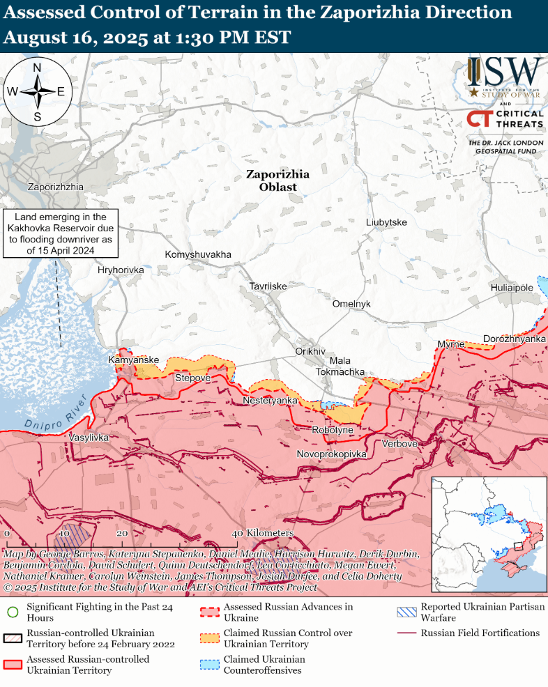 Аналитики ISW сообщают, что 16 августа в Курской области продолжались локальные бои. Несмотря на продолжение атак, российским войскам не удалось продвинуться. Между тем российские «военкоры» заявляют, что украинские силы также осуществляют контратаки в этом регионе.