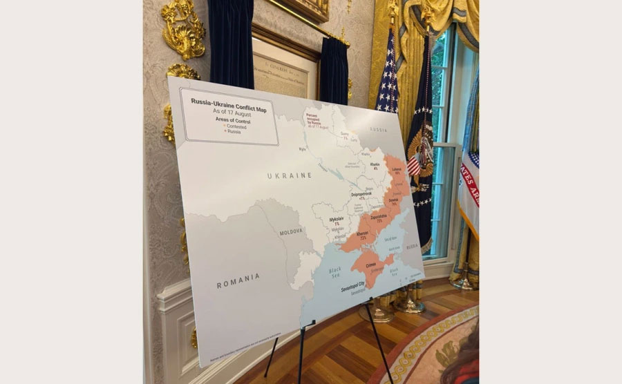 У Авальным кабінеце перад закрытай часткай перамоваў украінскага і амерыканскага прэзідэнтаў Уладзіміра Зяленскага і Дональда Трампа разгарнулі вялізную мапу баявых дзеянняў, піша BBC.