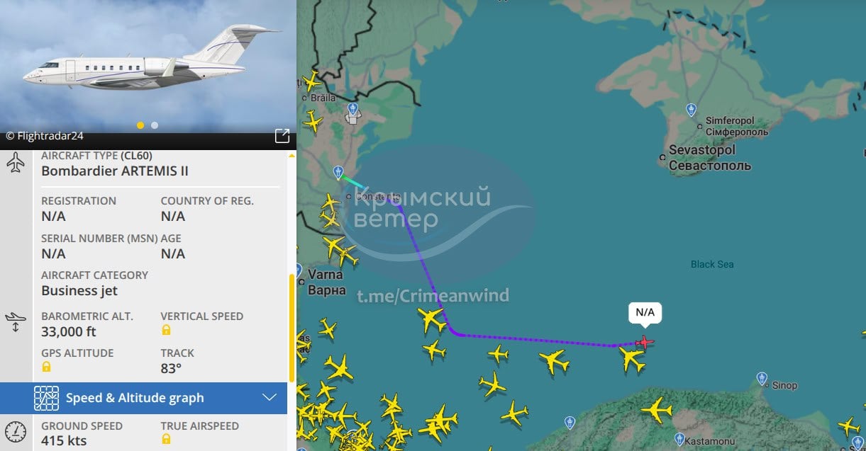 Партал Flightradar зафіксаваў над акваторыяй Чорнага мора амерыканскі самалёт Bombardier ARTEMIS II, які ўзляцеў з румынскага аэрадрома Міхаіл Когельнічану.