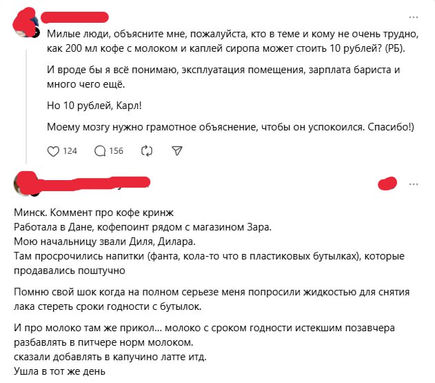 У адказ іншая каментатарка расказала, што напраўду адбываецца ў гандлёвых пунктах. Паводле ейных слоў, на адным з кава-поінт у «Dana Mall» побач з крамай «Zara» пратэрмінаваныя напоі прымушалі прадаваць далей — тэрміны прыдатнасці мылі вадкасцю для зняцця лаку. А малако з прамінулым тэрмінам прыдатнасці проста разводзілі свежым і дадавалі ў каву. Аўтарка піша, што пасля гэтага адразу звольнілася.