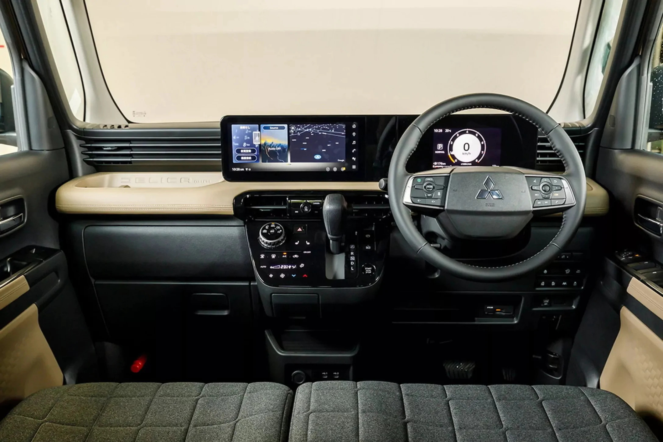 В четырехместном салоне Mitsubishi Delica Mini установлен цифровой щиток приборов и 12,3-дюймовый тачскрин. Рычаг КПП расположен довольно высоко Кроме того, улучшили внутреннюю отделку, усилили шумоизоляцию и установили камеры кругового обзора.