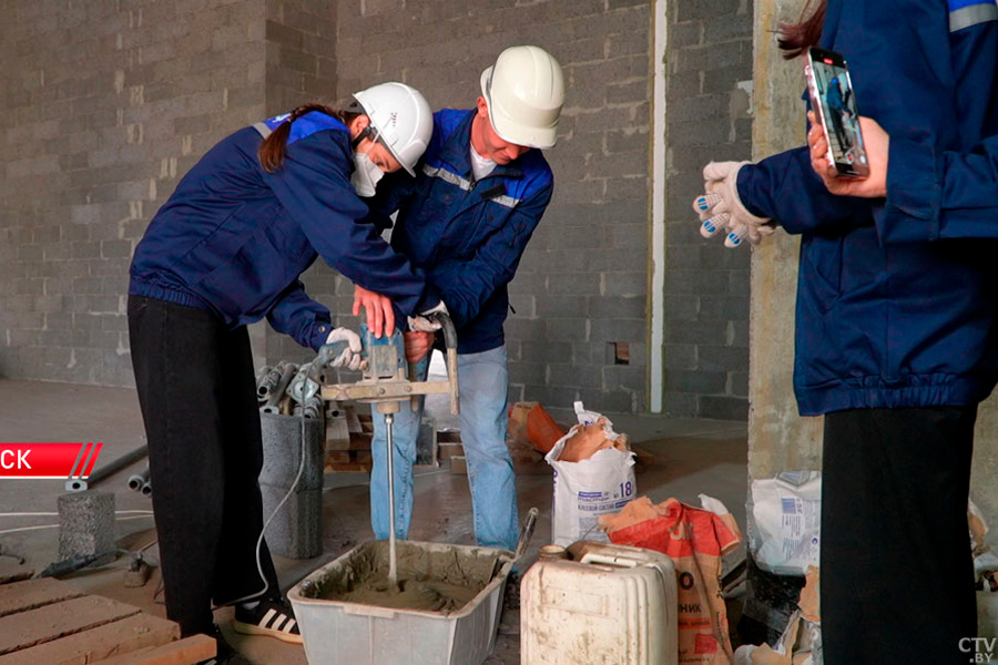 Девушки продолжили осваивать рабочие профессии и отправились на одну из Всебелорусских молодежных строек – Национальный исторический музей.