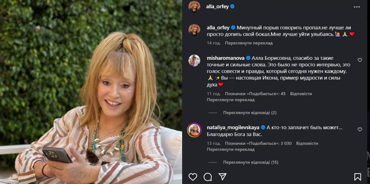 Не сакрэт, што шчырая размова артысткі, у якой яна раскрытыкавала расійскія ўлады і асудзіла крывавую вайну, выклікала рэзананс. Многія падтрымалі пазіцыю Алы Барысаўны і падзякавалі ёй. Але ў Маскве ўжо адрэагавалі на гучныя заявы выканавіцы, у прыватнасці, прэс-сакратар расійскага Міністэрства замежных спраў Марыя Захарава абвінаваціла 76-гадовую Пугачову ў «ліцемерстве».