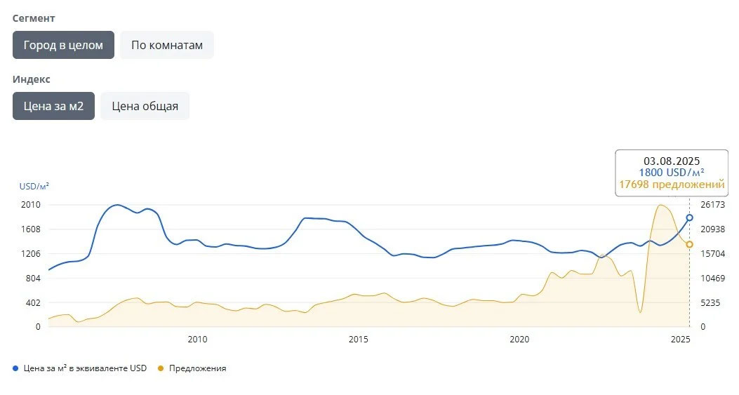 Цяпер рынак нерухомасці ў Мінску перагрэты. Паводле даных Realt.by з верасня мінулага года колькасць прапаноў жылля на рынку падала — з 26,1 тысячы на піку да 17,6 тысячы ў жніўні 2025 года. А сярэдні кошт за квадратны метр устойліва расла з $1343 да $1800. Даражэй сярэдні квадратны метр мінскага жылля каштаваў толькі ў далёкім 2007 годзе, калі яго кошт пераадолеў адзнаку ў $2000.