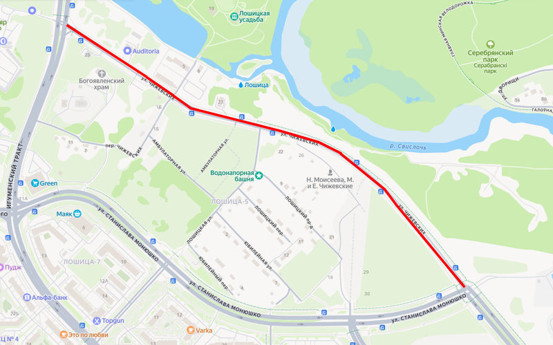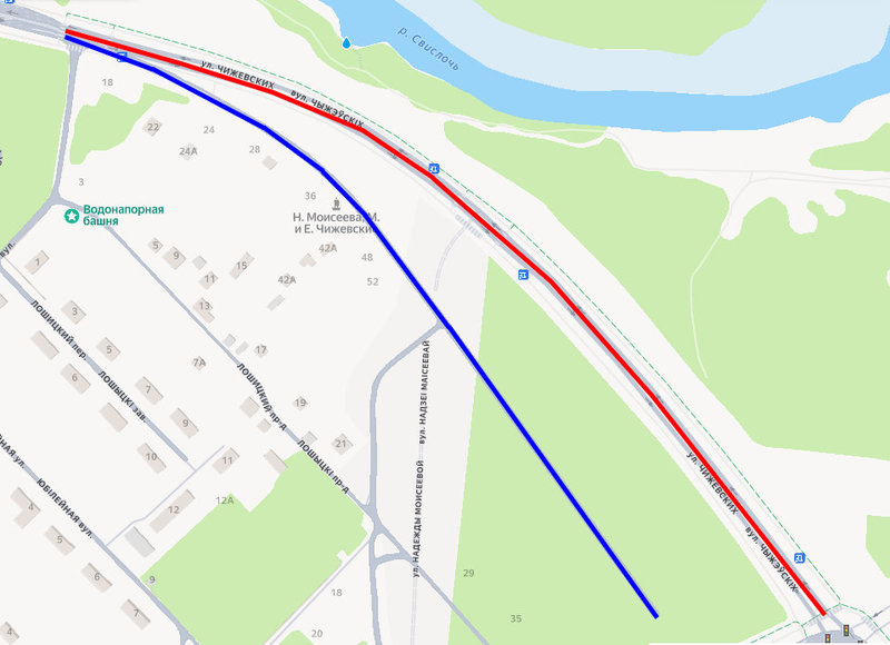 Цяпер вуліца адкрытая, але па новай трасіроўцы. Мы пазначылі на мапе чырвоным колерам новы ўчастак, а сінім — старую вуліцу Чыжэўскіх.