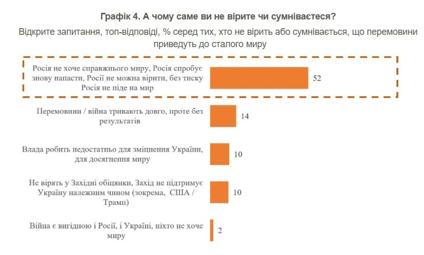 «Большасць такіх рэспандэнтаў (52%) тлумачаць [...] тым, што Расія не хоча сапраўднага міру, што Расія плануе працягваць вайну і г.д. Напрыклад, прамая мова некалькіх рэспандэнтаў: «Мэта Расіі — знішчэнне Украіны, яны не супакояцца», «Пакуль у расіян будуць заставацца рэсурсы, яны будуць рухацца наперад», «Таму што слоўныя аргументы не прымушаюць Расію да дзеяння», — піша КМІС.