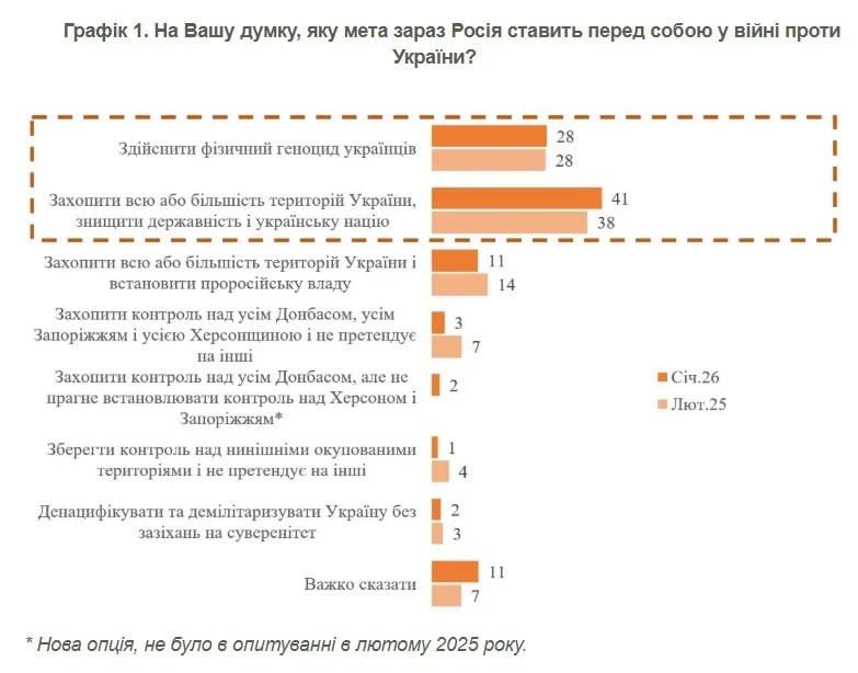 41% выбралі варыянт адказу: «Захапіць усю або большасць тэрыторый Украіны і ўсталяваць прарасійскія ўлады». 28% лічаць, што вайна РФ вядзецца дзеля фізічнага генацыду ўкраінцаў.