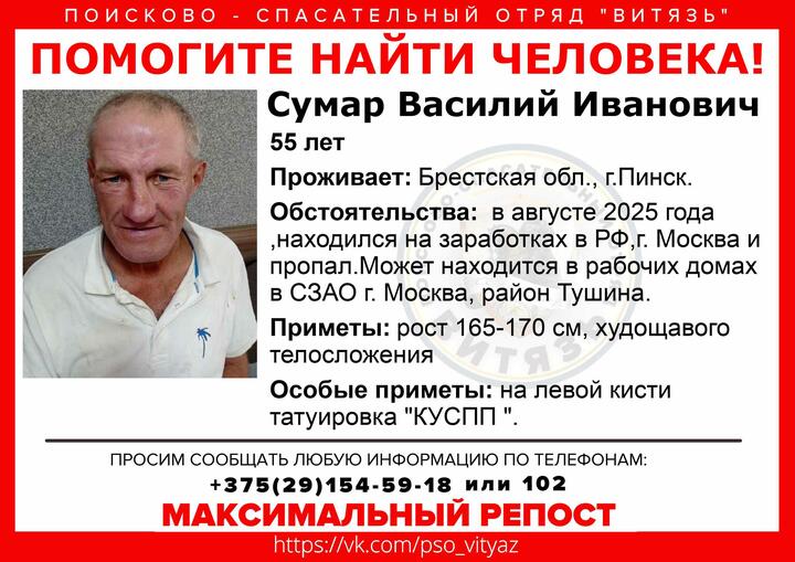 У Расіі знік 55-гадовы ўраджэнец Пінска (Брэсцкая вобласць) Васіль Сумар. Яго арыенціроўку размясціў пошукава-выратавальны атрад «Віцязь».
