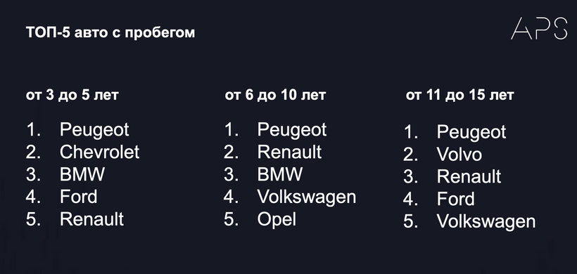 У катэгорыі «ад 3 да 5 гадоў» другім па папулярнасці брэндам стаў Chevrolet. Бронза — у BMW. Следам ідуць Ford і Renault. Калі казаць пра машыны ад 6 да 10 гадоў, то рэйтынг (пасля Peugeot) выглядае так: Renault, BMW, Volkswagen, Opel. У катэгорыі «ад 11 да 15 гадоў» за Peugeot следуюць Volvo, Renault, Ford, Volkswagen.