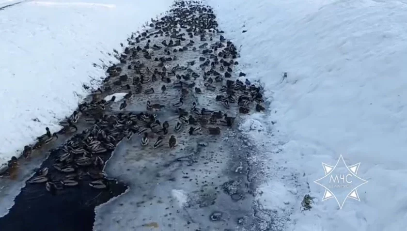У райцэнтры Іванава ў Брэсцкай вобласці на ўчастку мясцовай ракі Самаранка па вуліцы Касманаўтаў на паверхні вады ўтварыўся лёд, які стаў пасткай для сотняў качак, паведамляе прэс-служба МНС.