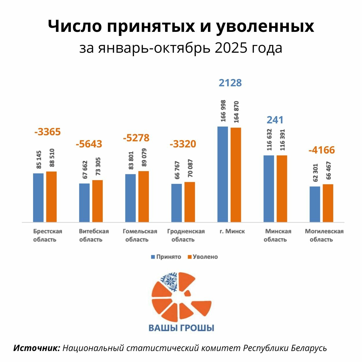 Паразгледзім, як адбывалася перамяшчэнне працоўнай сілы на рынку працы апошнім часам. Па выніках студзеня–кастрычніка 2025 года Мінск аказаўся нетта-атрымальнікам: +2 128 занятых (166 998 прынята супраць 164 870 звольнена). Мінская вобласць — таксама ў невялікім плюсе: +241. А вось усе астатнія рэгіёны сышлі ў мінус: найбольшы адток бачым з Віцебскай вобласці (–5 643 чалавек), следам у антырэйтынгу размясцілася Гомельская вобласць (–5 278 чалавек), у сярэдзіне — Магілёўшчына (–4 166 чалавек), крыху лепш справы ў Брэсцкай (–3 365 чалавек) і Гродзенскай (–3 320 чалавек) абласцях.