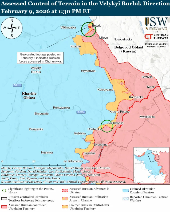«Геалакацыйныя відэазапісы, апублікаваныя 8 лютага, паказваюць, як украінскія войскі ачышчаюць заходнюю Чугуноўку (на паўночны ўсход ад Вялікага Бурлука)», – адзначаюць аналітыкі.