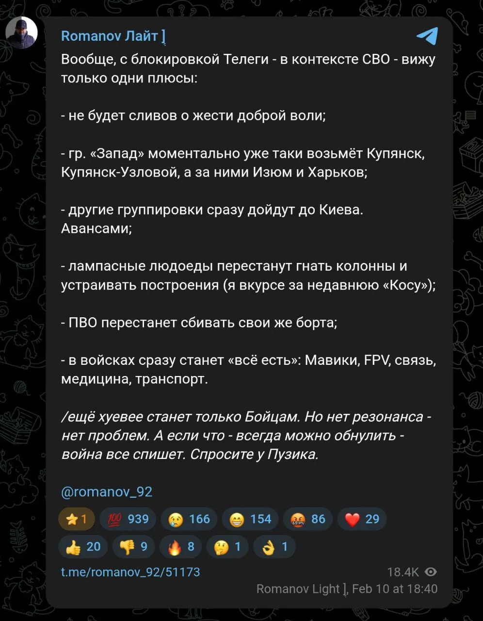 «Telegram фактычна выконвае ролю «палявога штаба ў кішэні». Таму любое запаволенне наўпрост б'е па кіравальнасці войскамі. Паводле ацэнак афіцэраў, страта аператыўнай перадачы відэа і выяў зніжае эфектыўнасць каардынацыі на 20–30%, асабліва ў лагістыцы і цэлеўказанні», — абураецца гэты Z-паблік.