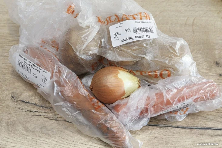 У гэтым аддзеле гародніну таксама ўзважвае прадавец — натуральна, з першага разу ідэальна адмераць усё на рубель нам не ўдаецца. Цыбуліна, дарэчы, абышлася ў 7 капеек. Морква — за 14 капеек, а бульбы два пакецікі — за 33 і 41 капейку.