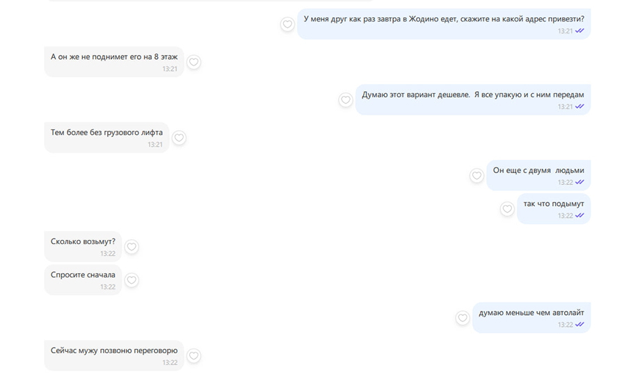 На думку дзяўчыны, прыяцель гродзенца, у адрозненне ад кур'ера, не зможа сам занесці шафу на восьмы паверх дома, у якім няма грузавога ліфта. У перапісцы яна таксама паведаміла адрас.