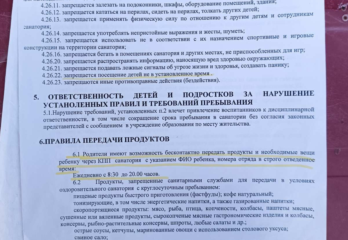 Аляксей прадставіў рэдакцыі дакумент, на які спасылаўся работнік санаторыя. У ім напісана, што «забараняецца наведванне дзяцей у неўстаноўлены час». Пры гэтым не ўдакладняецца, дзе менавіта можна пагаварыць з дзіцем у дазволеныя гадзіны — на тэрыторыі комплексу, за яго межамі ці ля агароджы. На сайце мы таксама не знайшлі тлумачэнняў пра тое, як арганізавана наведванне дзяцей бацькамі.