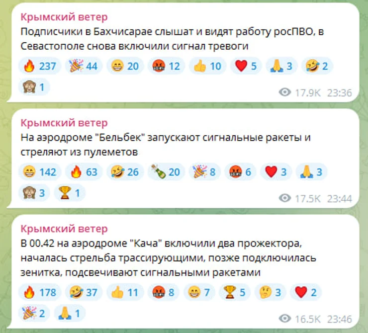 Паводле інфармацыі Telegram-канала «Крымскі вецер», дроны расіяне спрабавалі збіваць на аэрадромах «Кача» і «Бельбек». У Севастопалі ўжо каторы раз за вечар прагучала сірэна на фоне пагрозы БПЛА, а ў Бахчысараі актыўна працуе расійская супрацьпаветраная абарона.
