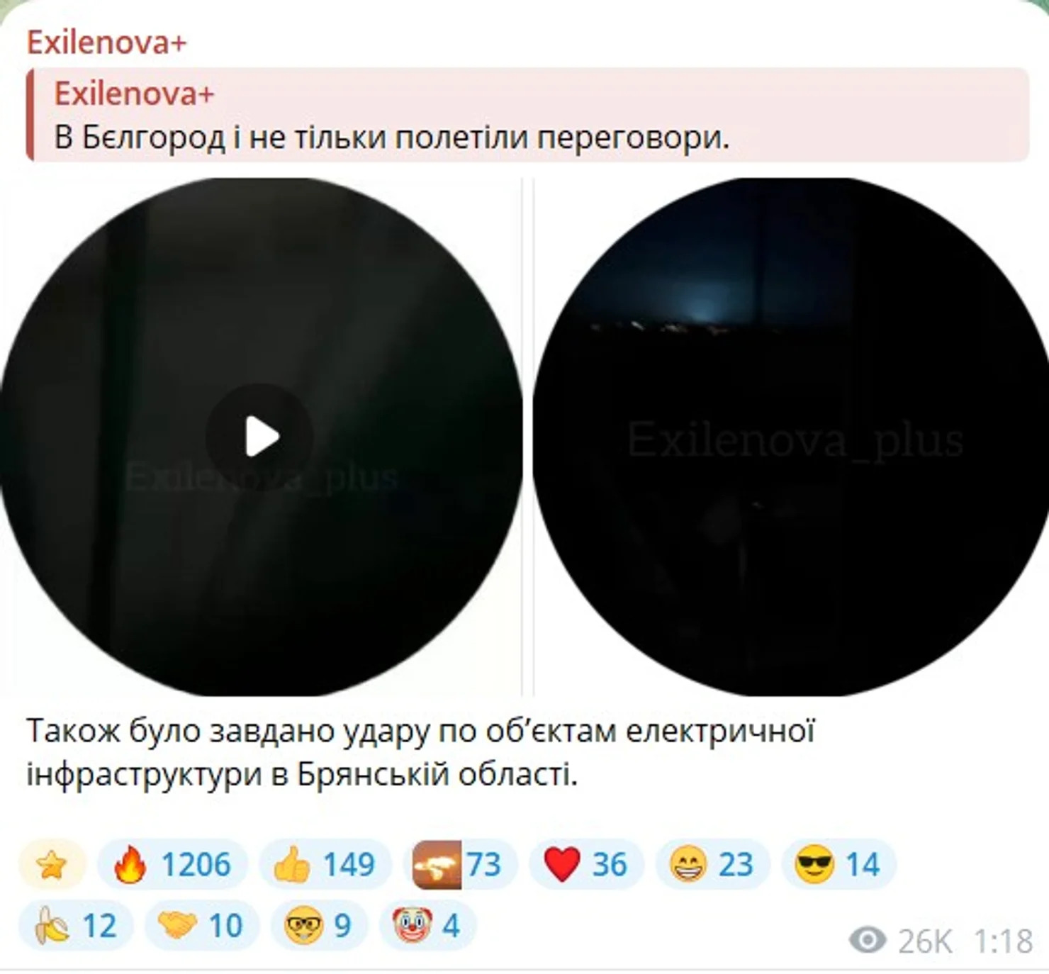 Тым часам у маніторынгавым канале Exilnova+ паведамілі пра надзвычайную сітуацыю ў Бранску. На кадрах з месца падзей — панарама горада без святла. Публікацыя з'явілася а 1:38 4 лютага і пазначана, што падзея адбылася ў Бранску, праз дзве гадзіны пасля блэкаўту ў Белгарадзе.