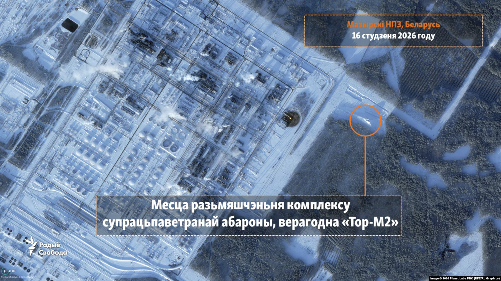 Побач з тэрыторыяй Мазырскага нафтаперапрацоўчага завода, з яе ўсходняга боку, на пачатку жніўня 2025 года з’явіўся комплекс супрацьпаветранай абароны, падобны да зенітна-ракетнага комплексу «Тор-М2». Гэта высветлілі журналісты праекта ўкраінскай службы Радыё Свабода «Схемы» на падставе аналізу спадарожнікавых здымкаў Planet Labs і апытання экспертаў.
