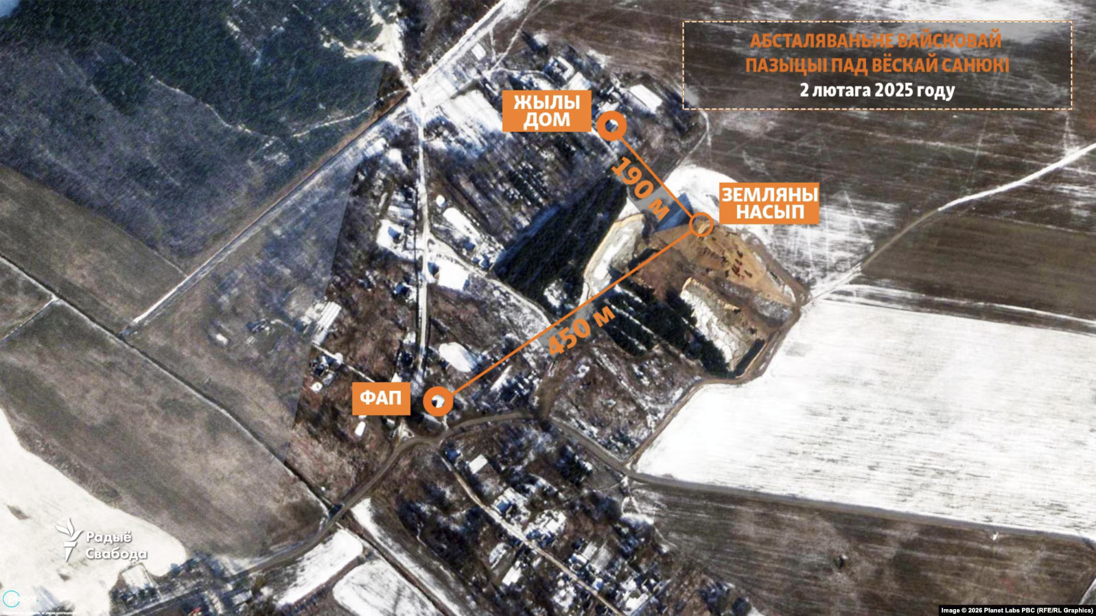 Ваенную пазіцыю пад Санюкамі арганізавалі на месцы невялікага пясчанага кар’ера на ўскраіне вёскі. На спадарожнікавых здымках відаць, што месца баявога дзяжурства размешчана даволі блізка да жылых дамоў. Да аднаго з іх каля 190 метраў, яшчэ да некалькіх — прыкладна 300 метраў. Прыблізна за 450 метраў знаходзіцца сельскі клуб, побач — мясцовы фельчарска-акушэрскі пункт, які абслугоўвае каля 85 жыхароў навакольных вёсак.