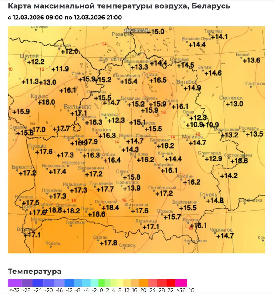 Паводле даных Telegram-канала @nadvorie, учора на метэастанцыях адразу ў 34 гарадах Беларусі былі абноўлены сутачныя тэмпературныя максімумы. Абсалютным рэкардсменам 12 сакавіка стаў Кобрын з яго +18,8°С, але на некаторых метэастанцыях назіраліся блізкія да гэтага значэнні: