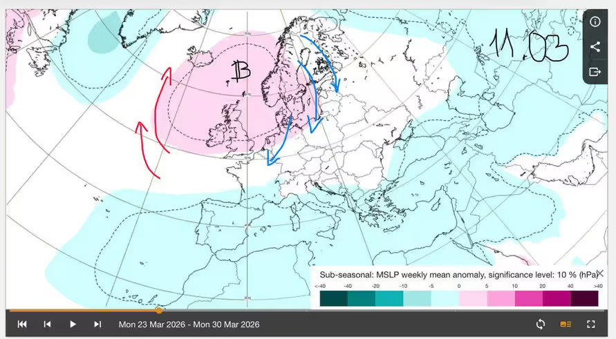 Тым часам аўтары Telegram-канала @nadvorie звярнулі ўвагу на зрух анамаліі высокага ціску ў раёне Скандынавіі, які паступова змяняе цыркуляцыю халоднага і цёплага паветра ў Еўропе. Паводле папярэдніх разлікаў спецыялістаў, яна напрыканцы сакавіка абяцае Еўропе перанос халоднага паветра і павышае рызыку лакальных замаразкаў ва ўмовах аслаблення ветру і ўзмацнення начнога радыяцыйнага выхаладжвання.