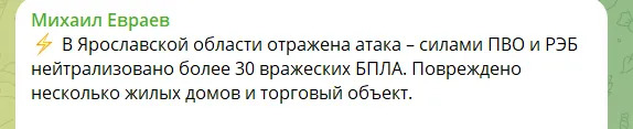 «Яраслаўль пад атакай БПЛА, у горадзе — серыя выбухаў, працуе ППА», – гаварылася ў паведамленні.