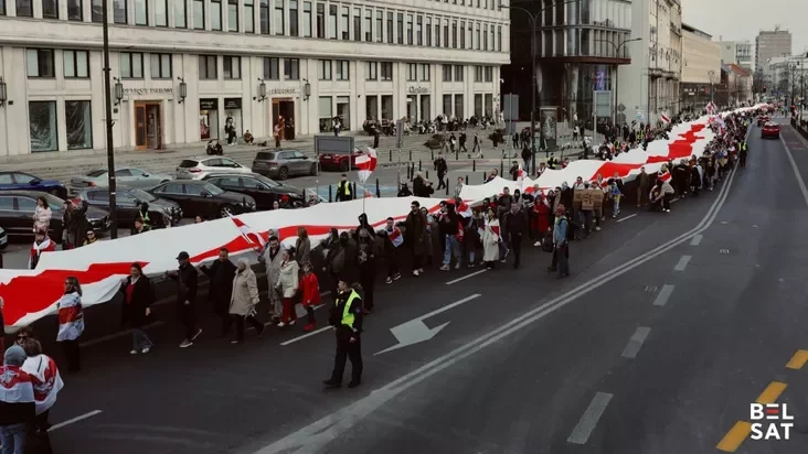 Падчас шэсця беларусы расцягнулі сцяг даўжынёй 330 метраў.