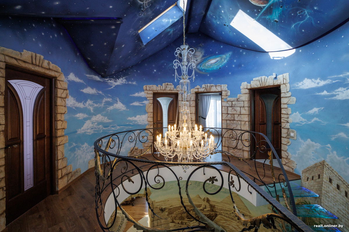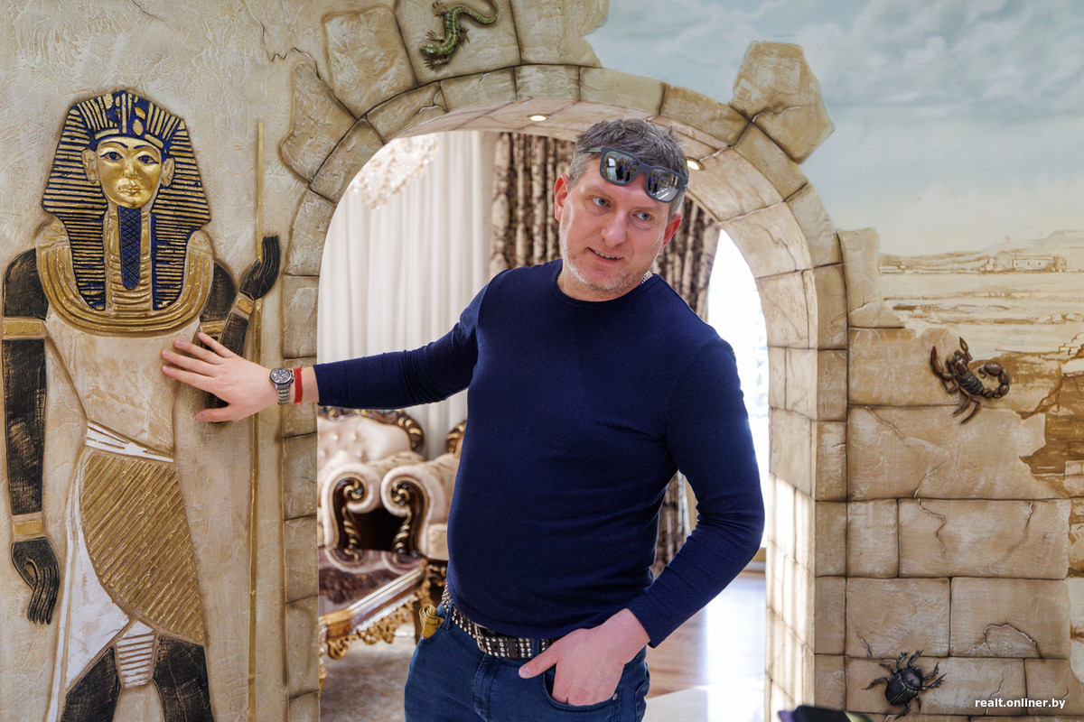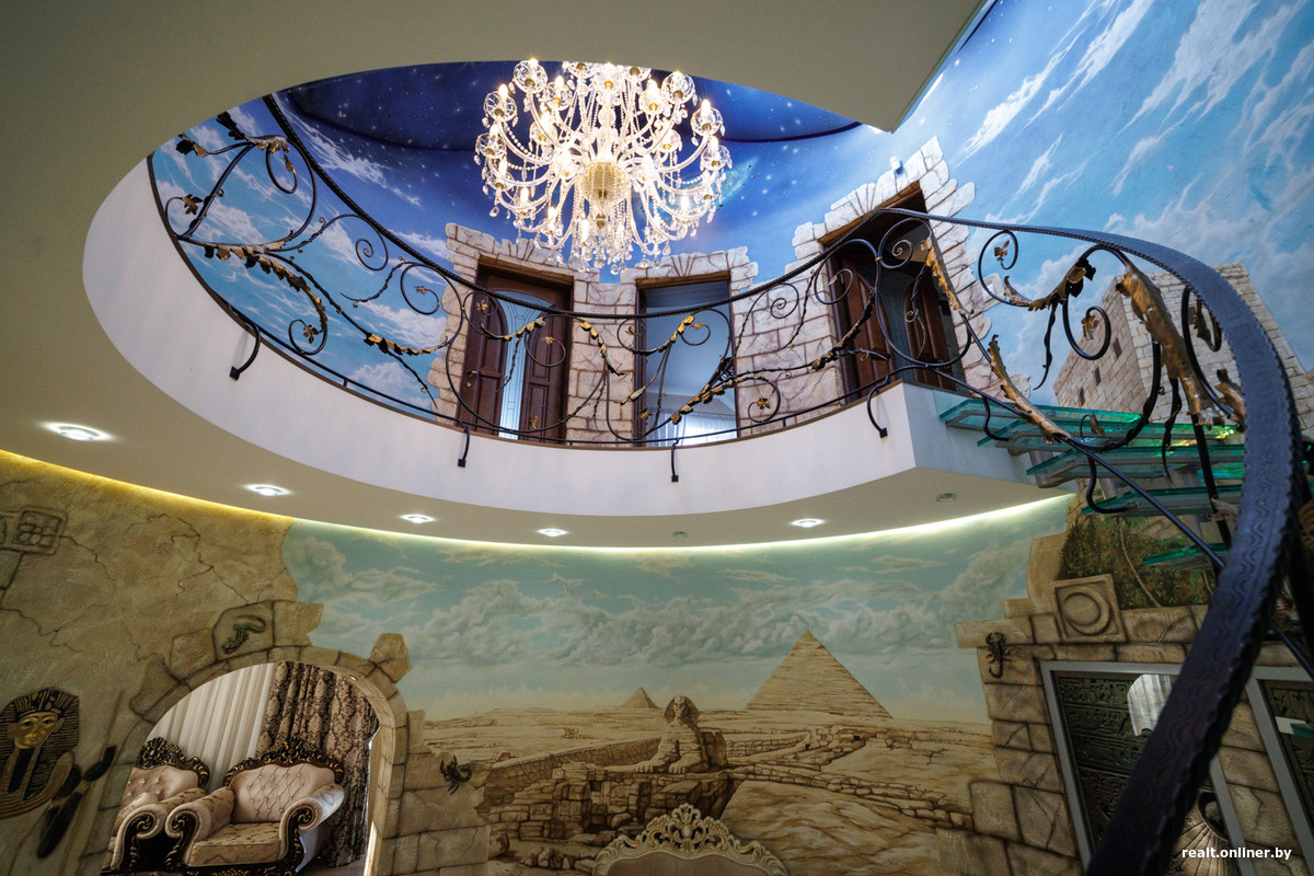 У сеціве гэты катэдж ужо паспелі ахрысціць «егіпецкім домам», «дыскатэкай у пірамідзе» і «усыпальніцай фараона». Тут і праўда не ўбачыш звыклых атрыбутаў сучаснага рамонту — беласнежных сцен, падлогі «пад дрэва» і дзвярэй-нябачнікаў. Замест «новай класікі» — дзясяткі кілаграмаў ручной працы: скарабеі і скарапіёны з тынкоўкі на сценах, луска дракона, металічныя кветкі ручной кавальскай працы на парэнчах лесвіцы. З першага погляду ўсяго і не ахопіш.