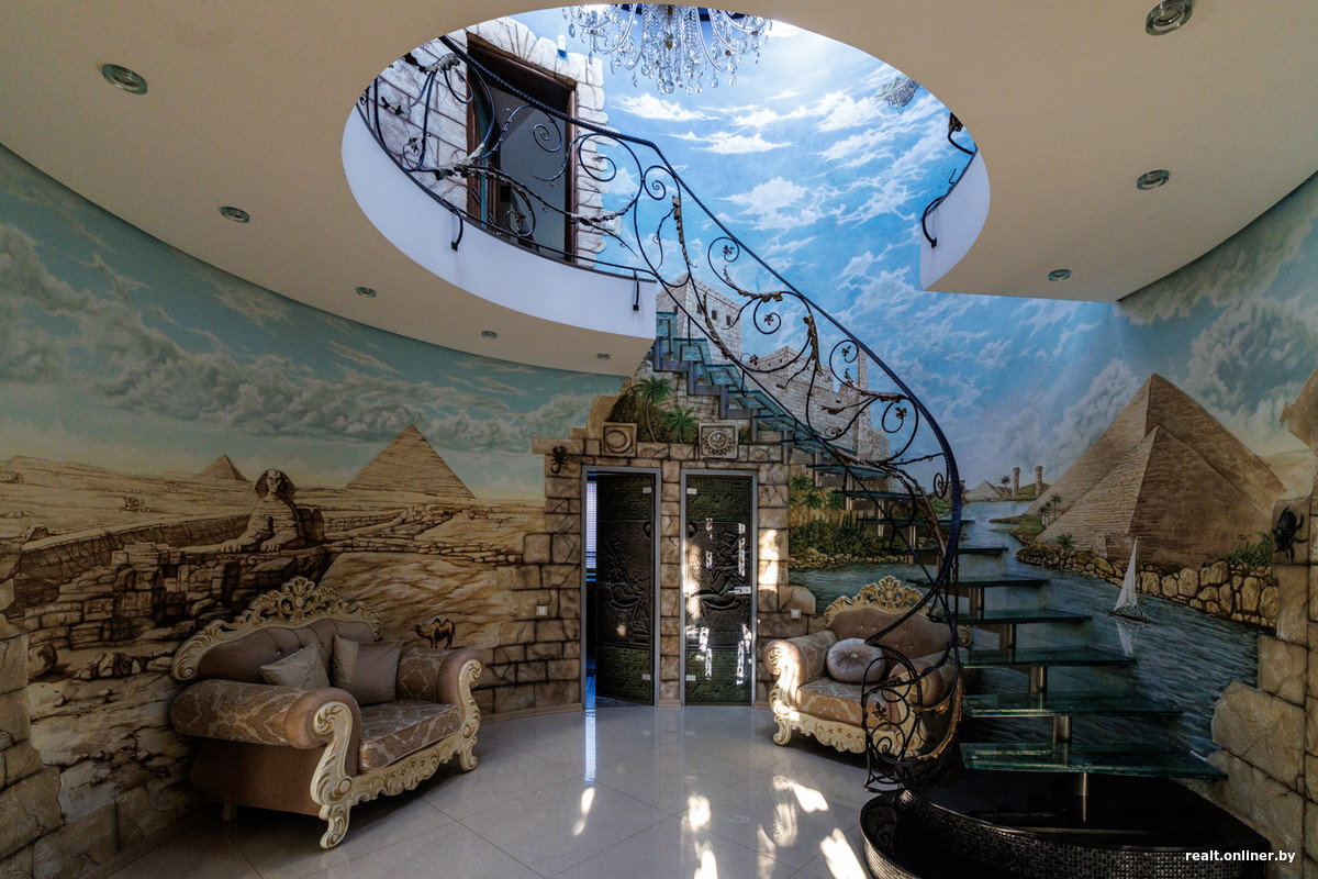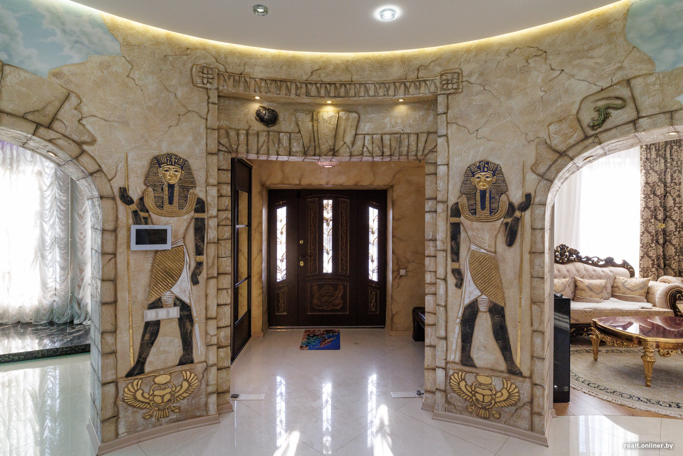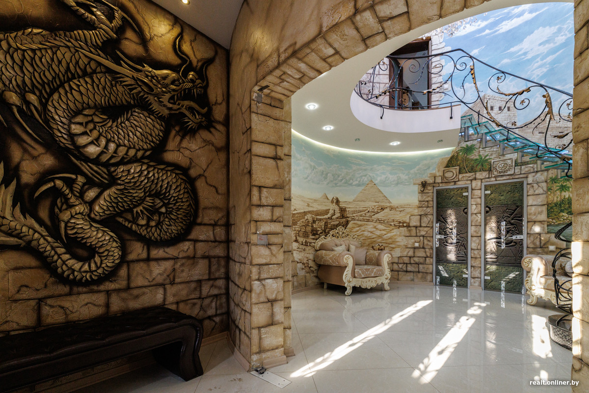 Але вернемся да ўладкавання дома. У невялікі («квадратаў» на пяць) перадпакой вядуць браніраваныя дзверы са спецыяльным уцяпленнем і шкленнем. Справа ад іх — гардэробная шафа. Злева — дракон на ўсю сцяну. Незразумела, якія сваяцкія повязі звязваюць яго з егіпцянамі, якімі дэкараваны ўвесь першы паверх, але выглядае гэта ўражліва.