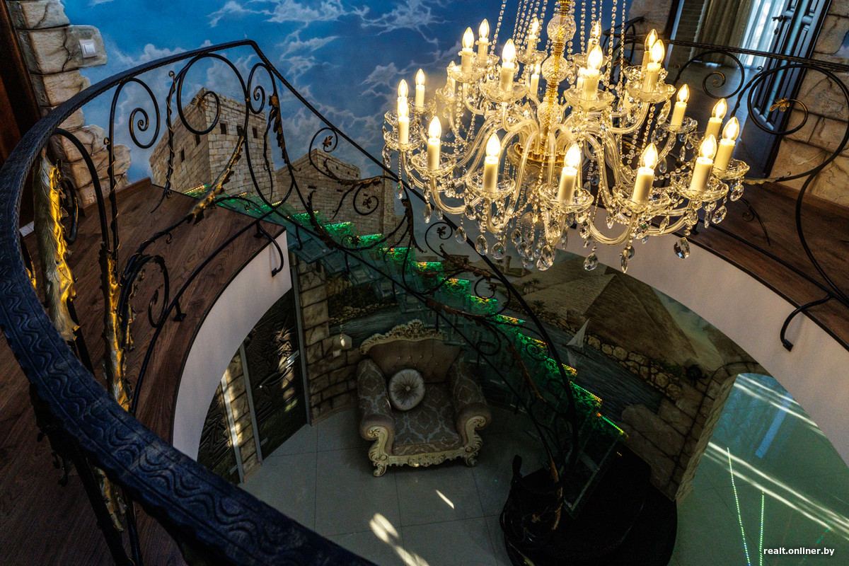 Па цэнтры дома, апускаючыся ад даху амаль да ўзроўню другога паверха, звісае люстра. «Крыштальная і вельмі нятанная», — удакладняе спецыяліст.