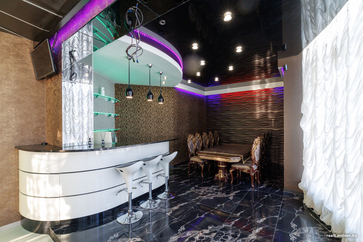 Усё астатняе прастора цалкам адкрытая. Замест дзвярэй — аркі з падсветкай, абрамленыя ляпнымі «цаглінкамі». Направа павернеш — трапіш у асабісты клуб, дзе на 40 квадратных метрах прысутнічаюць усе элементы дыскатэкі з караоке.