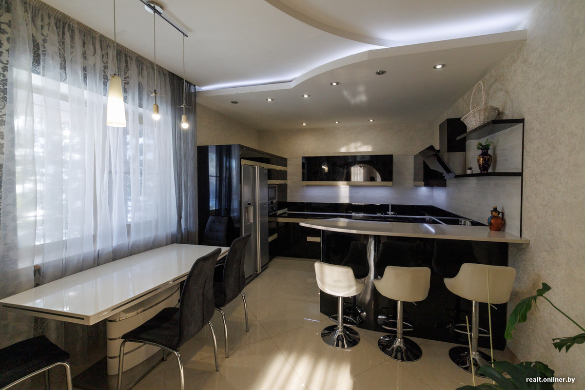 Гасцінная прахадная. З яе арка вядзе ў кухню (амаль 20 «квадратаў») у чорна-белых танах. Тут ужо ўсё па класіцы: газавая варочная панэль, разсоўны стол, кампактная паўкруглая барная стойка-востраў, убудаваная тэхніка.
