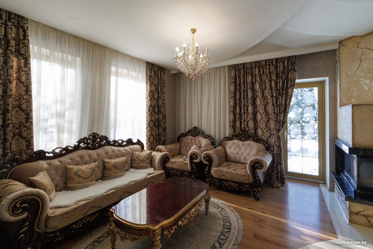 Налева ад хола — гасцінная з камінам і выхадам на тэрасу. Тут ужо няма егіпецкага каларыту. Замест яго нас нечакана сустракае неакласіцызм: масіўныя «імперскія» канапа і крэслы, столік з разьбянымі ножкамі, цяжкія шчыльныя фіранкі, вялікі камін. Усё выканана ў бэжавых і шакаладна-карычневых танах. З агульнай танальнасці «царскіх пакояў» выбіваецца хіба што тэлевізар на ўсю сцяну.