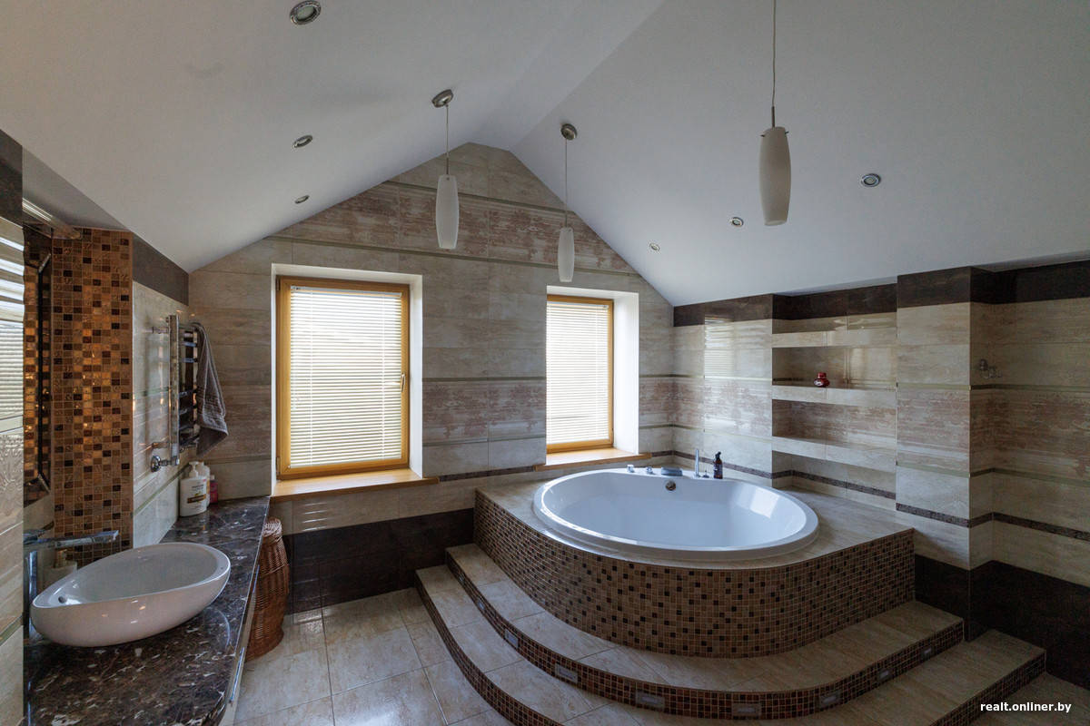 Усё астатняе прастора тут схавана за дзвярыма. Першая ад лесвіцы пакой — ванная на 11 «квадратаў». У пакоі два вокны, гранітная стальніца, джакузі на пастаменце.