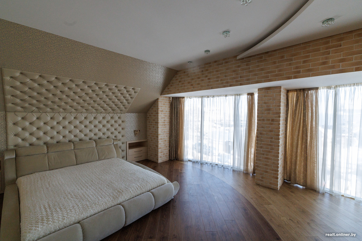 Памятаем, што паверх мансардны, таму геаметрыя ўсіх пакояў тут ломаная. У спальнях — ніякай эксцэнтрыкі, усё максімальна базавае.