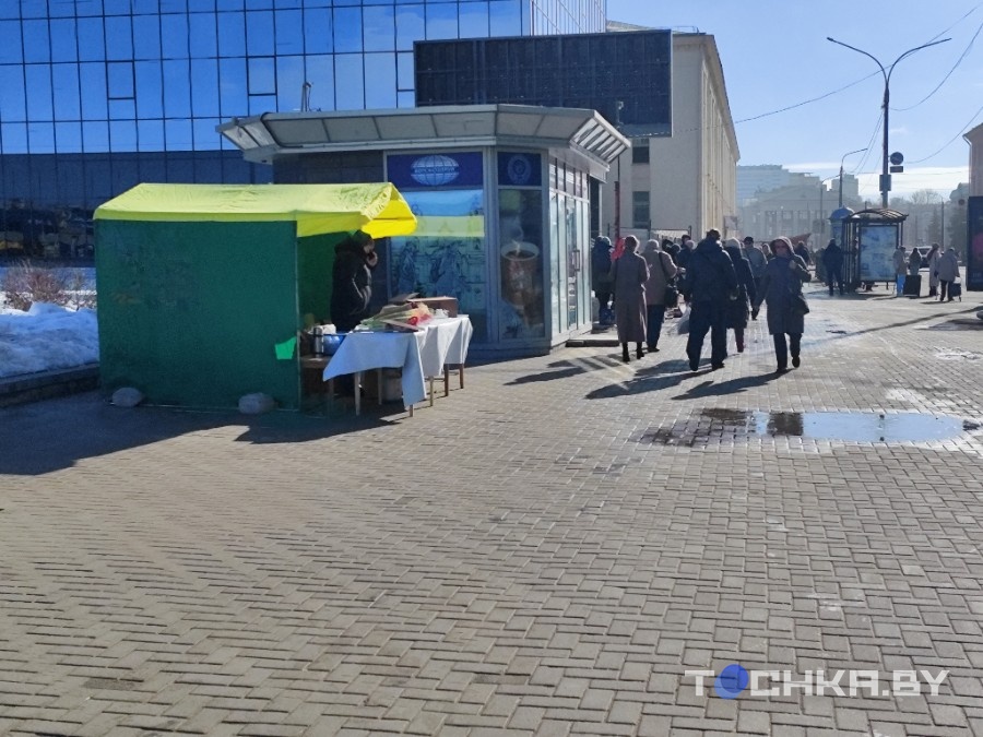 Але сама кропка выглядае так, быццам яе акурат перанеслі ў сучасны свет з 90-х. Пластыкавыя сталы, крыху стомленая палатка і прадаўцы, закутаныя ў курткі.