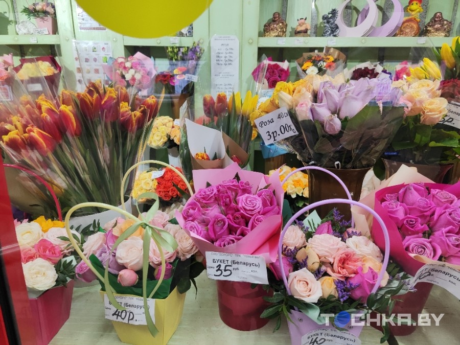 У цэлым Мінск ужо прыкметна расквітнеў. На вуліцах усё часцей сустракаюцца дзяўчаты і жанчыны з кветкамі, вітрыны і пераходы літаральна заваленыя букетамі.