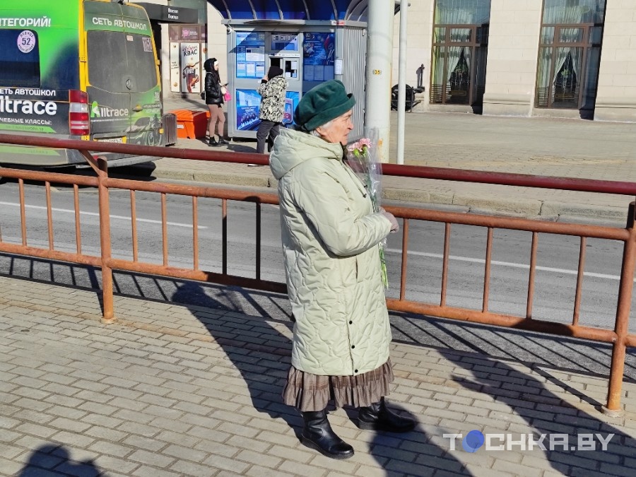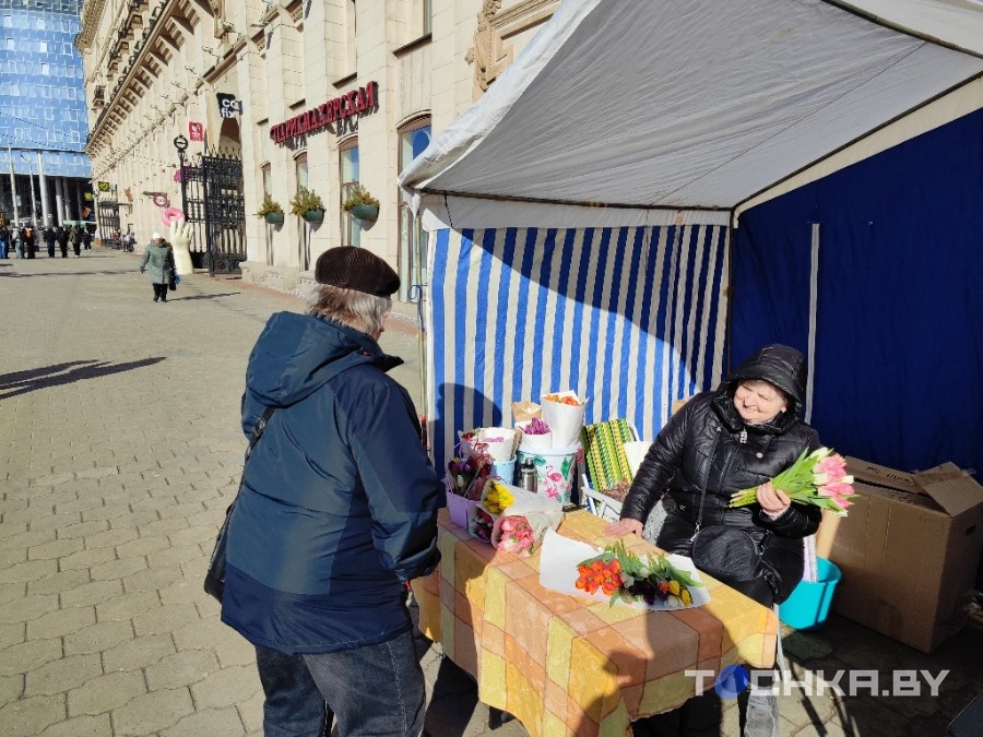 Але прадаўцы стараюцца. Расстаўляюць вядры з цюльпанамі, папраўляюць букеты, рыхтуюцца да патоку людзей. Кветкавае свята тут робяць літаральна на выхадзе з вакзала: сышоў з цягніка, купіў букет і пайшоў віншаваць.