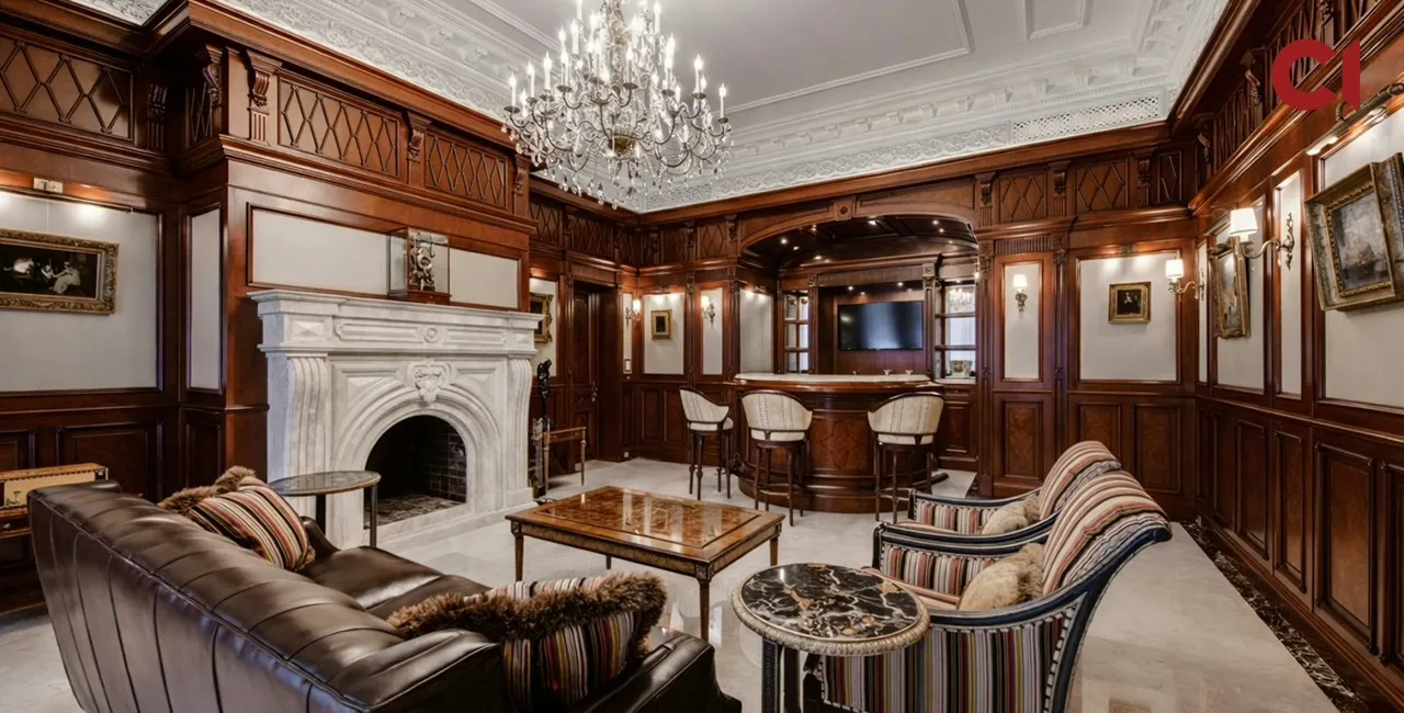 Як вынікае з апісання, у доме абсталяваныя камінная зала, сталовая, кухня, кінaзал, СПА-зона з басейнам, саўнай і хамамам, трэнажорная зала, пакоі для персаналу і пральня. На другім паверсе размешчаны спальні з асобнымі санвузламі, кабінет, бібліятэка, гасціныя і дадатковыя памяшканні. У будынку таксама ёсць ліфт і схаваная сістэма відэаназірання. На тэрыторыі прадугледжаны гараж на пяць аўтамабіляў і паркоўка яшчэ на пяць машын.