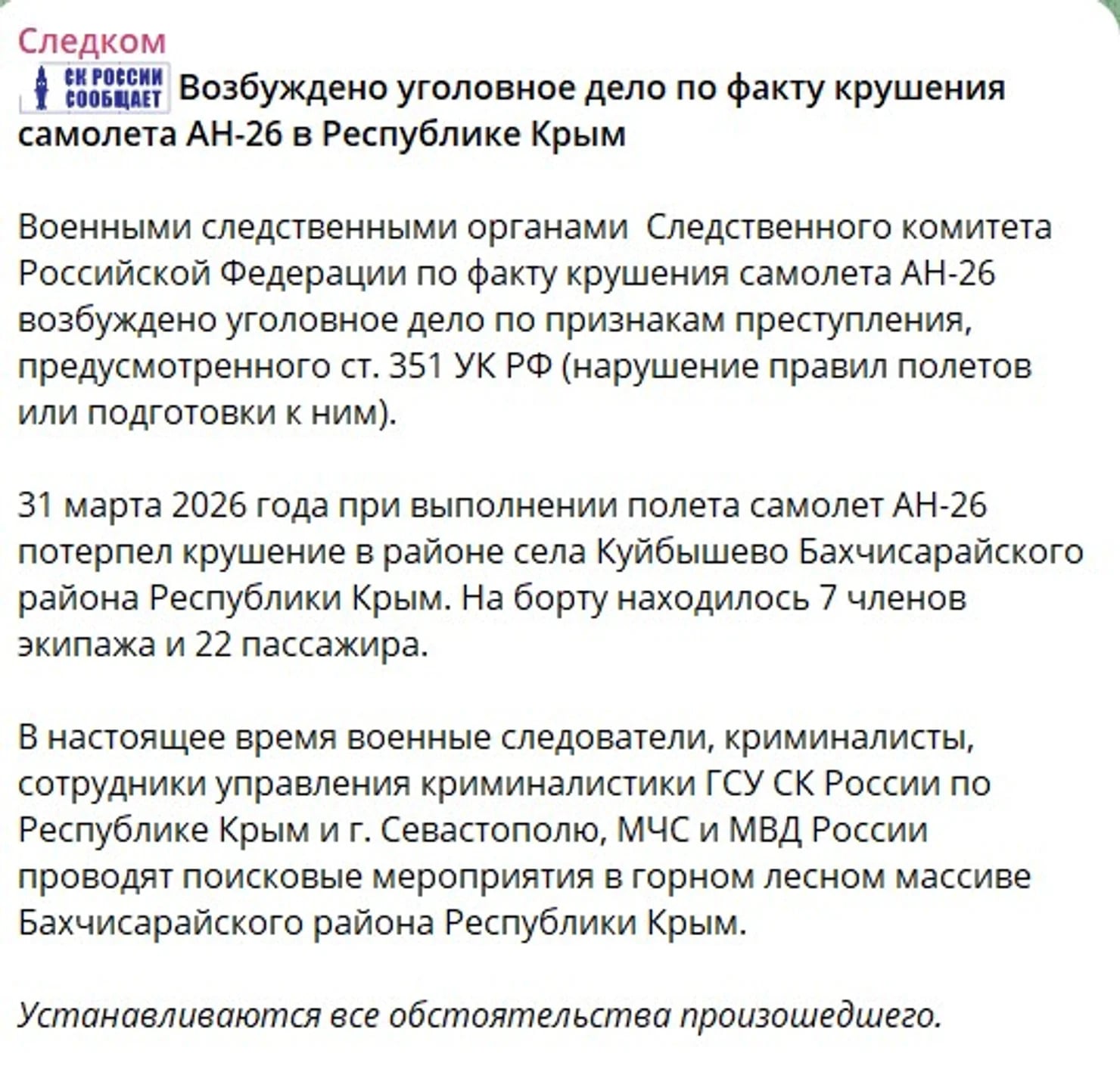 Адзначым, што увечары 31 сакавіка ў расійскіх пабліках з'явілася інфармацыя пра страту самалёта Ан-26 у часова акупаваным Крыме. Паводле даных канала сіл супраціву «Крымскі вецер», інцыдэнт адбыўся ў Бахчысарайскім раёне. Указваецца, што самалёт па невядомых прычынах урэзаўся ў скалу. Мінабароны РФ пацвердзіла авіякатастрофу з Ан-26. У першых заявах ведамства гаварылася пра 29 загінулых, з якіх сямёра былі членамі экіпажа, яшчэ 22 — расійскімі вайскоўцамі.