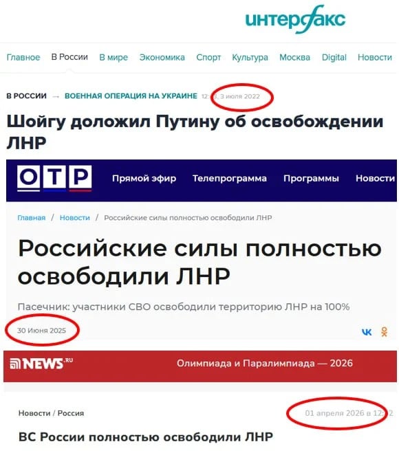У сацсетках актыўна абмяркоўваюць калаж, на якім паказаны аналагічныя заявы расійскіх СМІ за 2022, 2025 і 2026 гады, падкрэсліваючы разыходжанне гучных справаздач Масквы з рэальнай сітуацыяй на фронце.