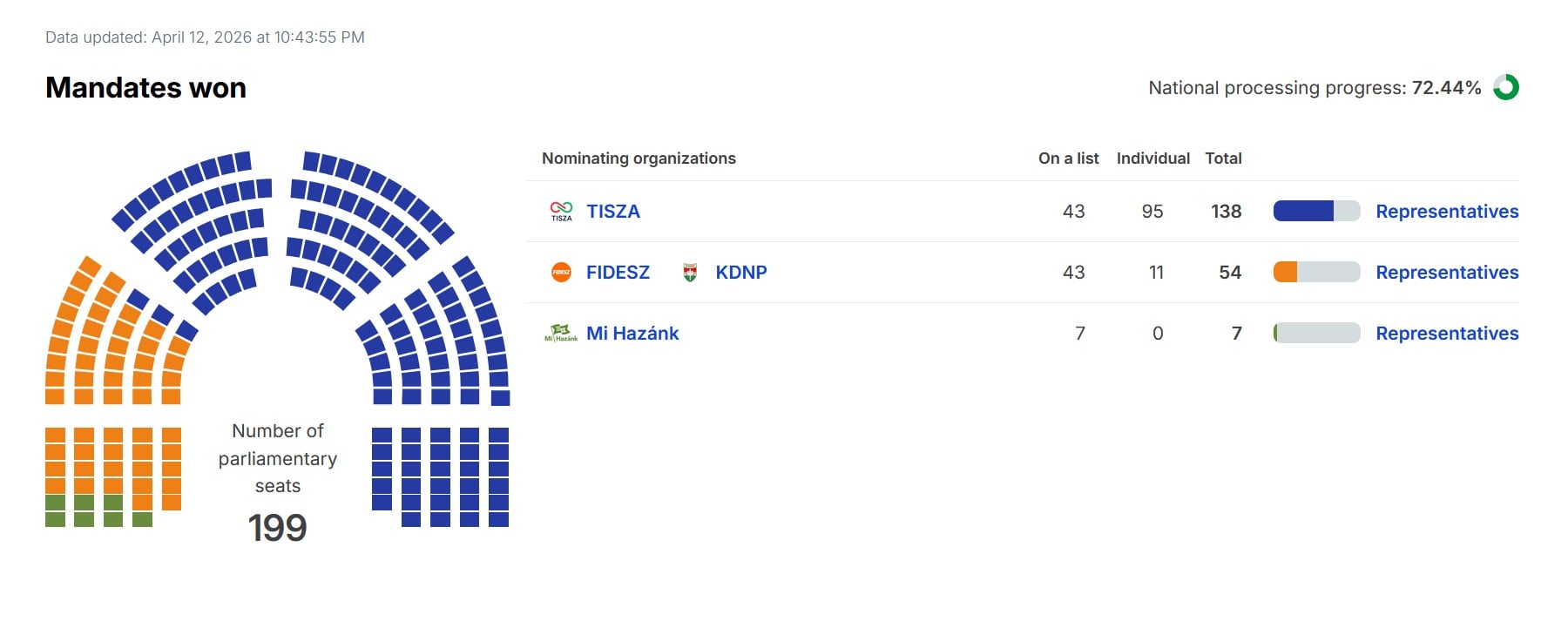 Пасля апрацоўкі 45,71% дадзеных лідзіруе партыя «Ціса» апазіцыянера Пэтэра Мадзяра, якая можа атрымаць 138 месцаў у 199-месным парламенце.